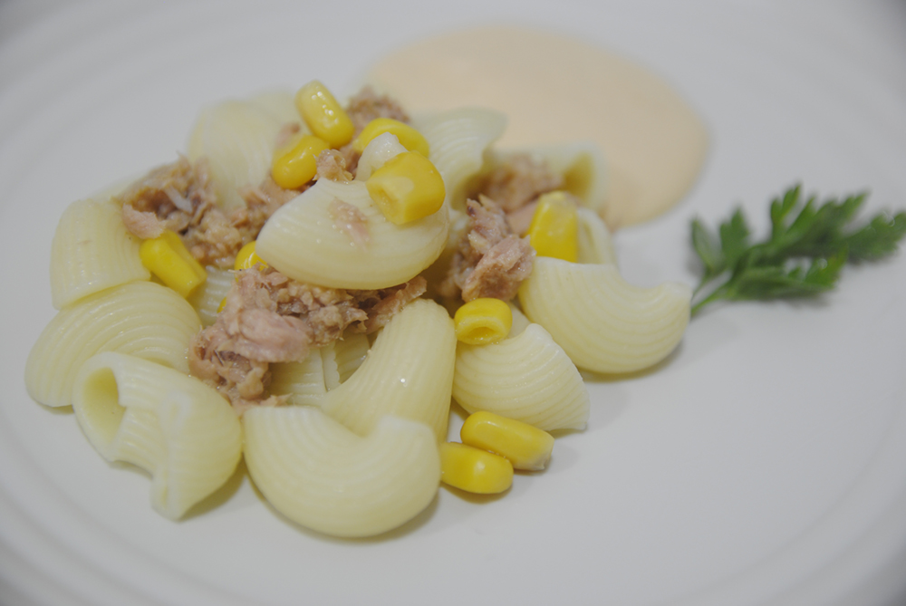 Por último añadimos el atún, el maíz y mezclamos con la salsa rosa.