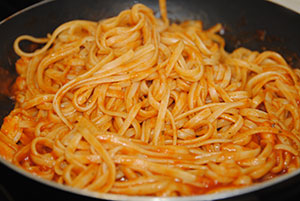 Añade la salsa de tomate a los tallarines y remueve, o si lo prefieres emplátalo colocando una ración de tallarines y añadiendo 2 o 3 cucharas de la salsa de tomate por encima.